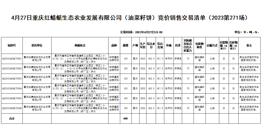 受重庆红蜻蜓生态农业发展有限公司委托,重庆市粮油批发市场有限责任公司(即国家粮食重庆交易中心,以下简称“批发市场”)定于2023年4月27日10:00举办重庆红蜻蜓生态农业发展有限公司(油菜籽饼)竞价销售交易会,现将有关事项公告如下: