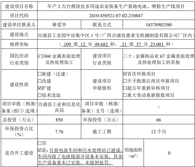 我局受理了广西合浦县惠来宝机械制造有限公司年产2万台模块化多用途农业装备生产基地电泳、喷粉生产线项目环境影响评价文件许可申请材料,经审查,拟作出同意审批意见。根据《中华人民共和国环境影响评价法》、《环境影响评价公众参与办法》(部令 第4号)、《中华人民共和国行政许可法》、《建设项目环境影响评价政府信息公开指南(试行)》(环办〔2013〕103号)等有关规定,现公示该项目基本情况。欢迎公众参与建设项目环境保护工作。