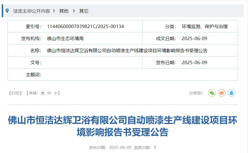 近日,佛山市生态环境局发布佛山市恒洁达辉卫浴有限公司自动喷漆生产线建设项目环境影响报告书受理公告。