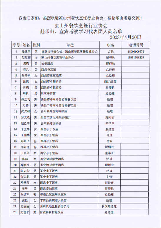 客走旺家门,热烈欢迎凉山州餐饮烹饪行业协会,莅临乐山考察交流!