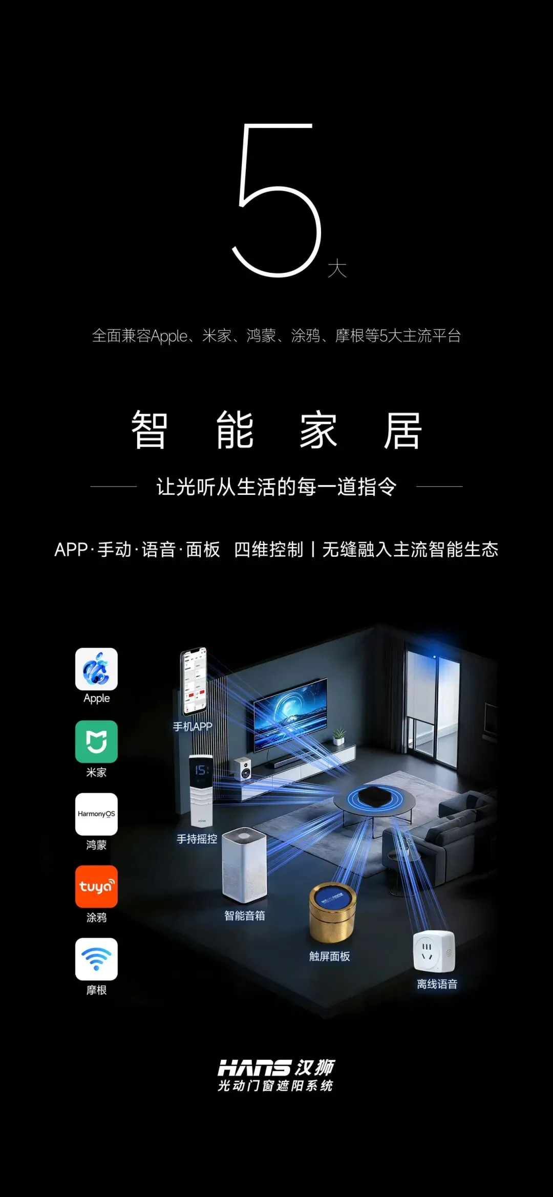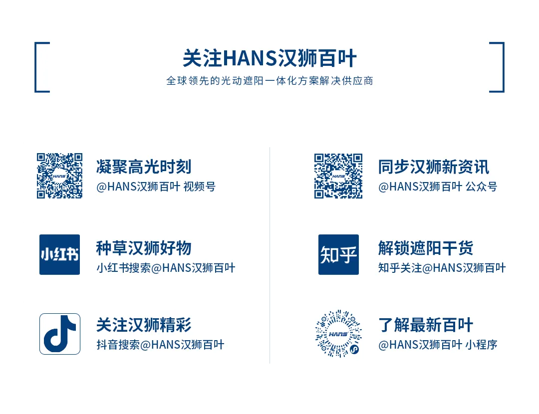 HANS汉狮致力于成为全球领先的光动遮阳一体化解决方案供应商。我们为建筑幕墙、星级酒店及高端住宅提供智能遮阳系统,帮助全球客户实现更智能、更舒适、更便捷的绿色智能遮阳体验。