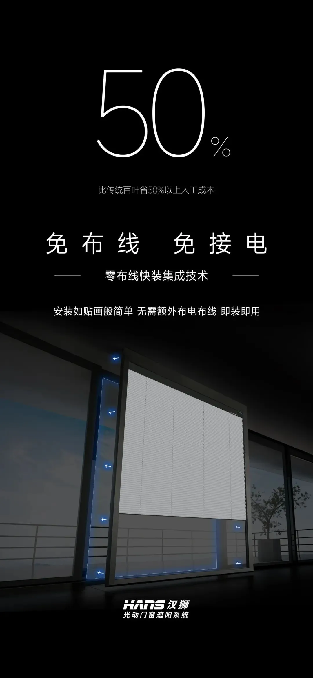采用一体化快装集成设计,无需额外布线与接电,安装如贴画般简单。相比传统百叶窗帘,可节省50%以上的人工与施工成本,实现快速安装、即装即用。