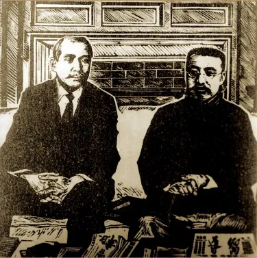 中国共产党积极推进民主联合战线的形成。西湖会议后,李大钊等与孙中山会谈国共合作事宜。图为李大钊与孙中山在上海会面(版画 魏谦绘)。