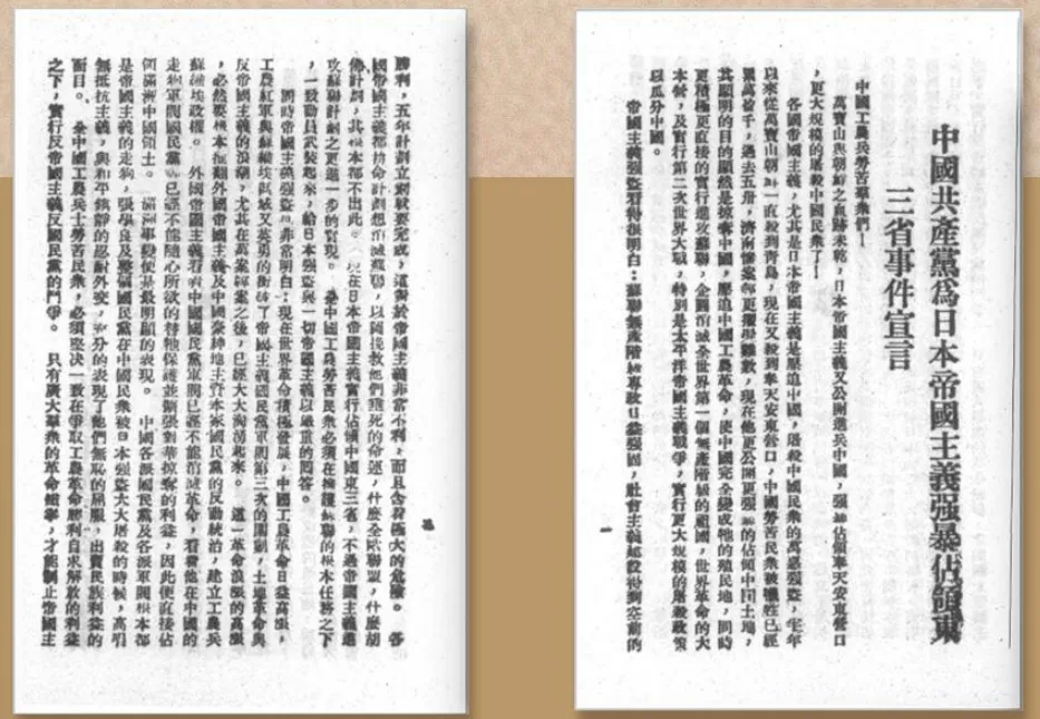 九一八事变后,中国共产党率先举起抗日大旗。1931年9月20日,中共中央发表《中国共产党为日本帝国主义强暴占领东三省事件宣言》,号召中国人民行动起来,反抗日本帝国主义的侵略行径。图为宣言部分内容。