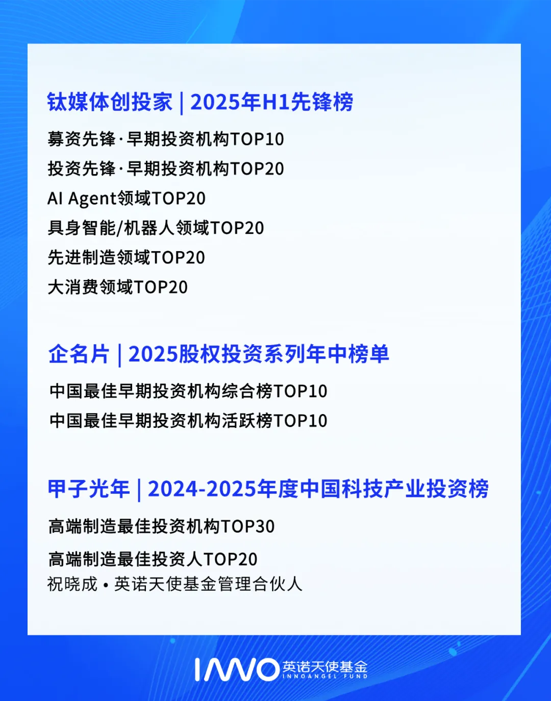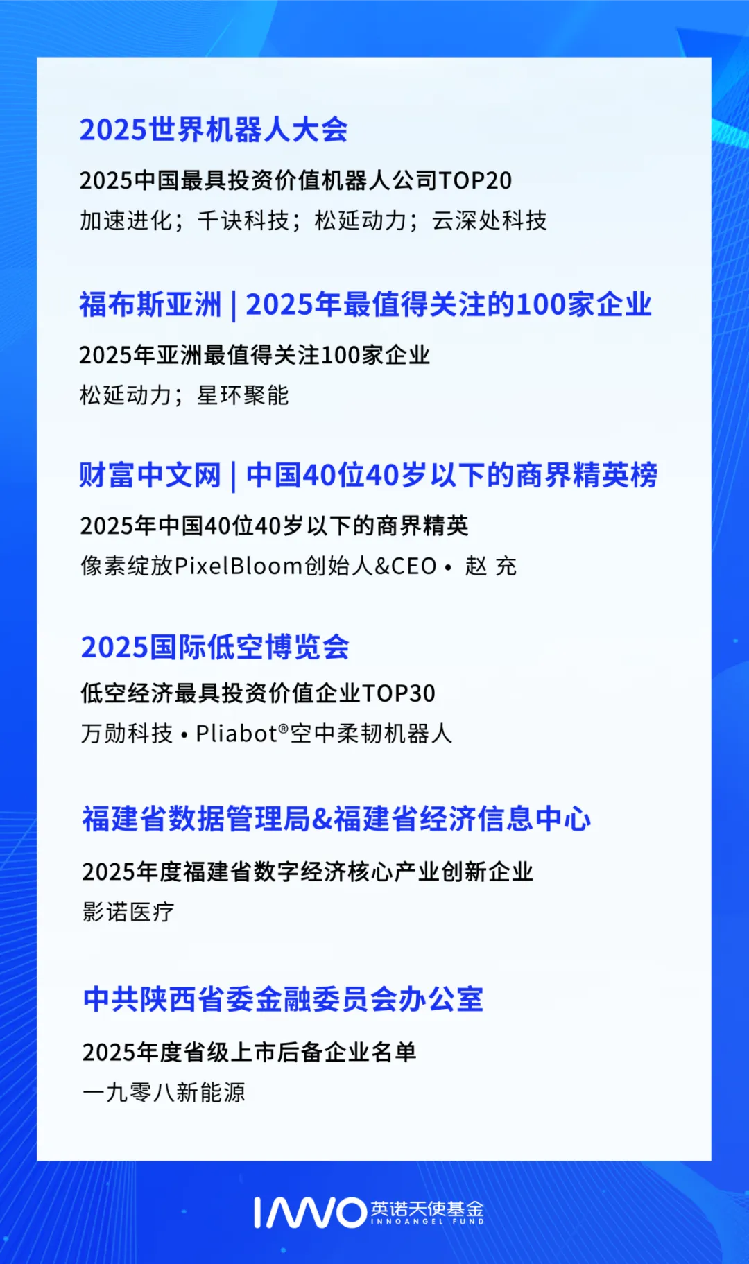 • 10+家企业稳中求进,取得新突破:海德氢能为壳牌EnergHyNet项目定制开发的先进电解槽解决方案成功通过工厂验收测试;优艾智合与优艾智合-西安交大具身智能机器人研究院联合发布全球首创“一脑多态”架构的跨场景集群作业人形机器人凌枢;国内首台搭载希倍动力钠离子电池的混动钻机正式下线交付...• 9家企业捷报频传,斩获行业荣誉:星环聚能入选福布斯亚洲“2025年亚洲最值得关注100家企业”;万勋科技于2025国际低空博览会荣膺“低空经济最具投资价值企业”;像素绽放PixelBloom创始人&CEO赵充入选2025《财富》中国40位40岁以下的商界精英榜...