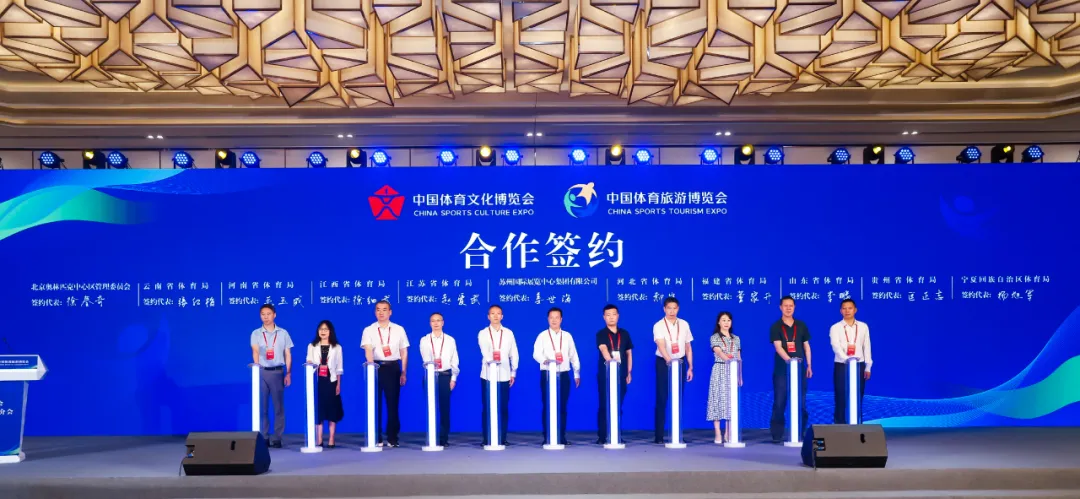 2023-2027年两个博览会落户苏州揭牌仪式、战略合作签约仪式上,河北、江苏、福建、江西、山东、河南、贵州、云南、宁夏等体育局和北京奥林匹克中心区管委会代表,中国“体育旅游专业协同联盟”、上海体育大学经济管理学院、中国体育旅游与文化大数据研究中心、四川省体育博物馆等高校和博物馆代表及体育企业代表进行了现场签约,正式拉开两个博览会筹备工作和招商招展工作的帷幕。