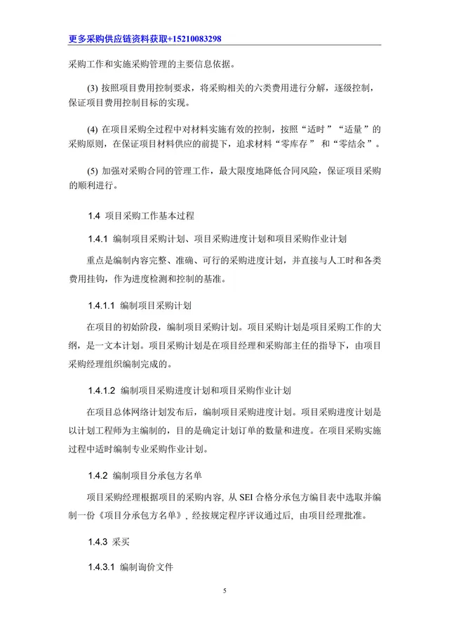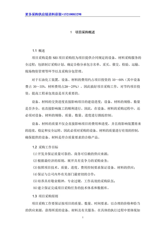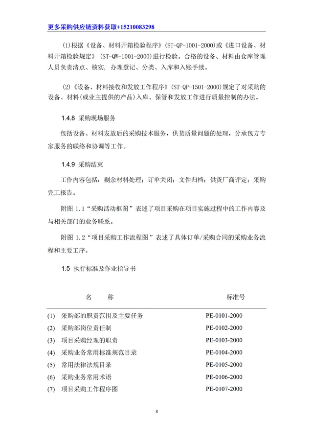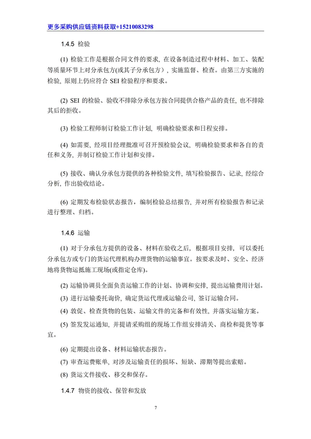 项目采购是指 SEI 项目采购组为项目提供合同规定的设备、材料采购服务的全过程;包括制订采购计划、确定合格分承包方名单、采买、催交、检验、运输、现场物资管理等环节以及采购分包管理。