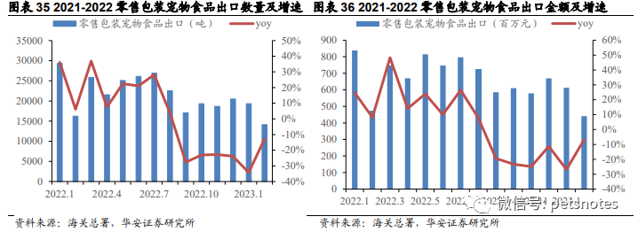 海外出口方面,受海外市场通胀压力以及海外客户调整库存周期影响,宠物食品出口承压,2023年1、2月零售包装宠物食品出口数量同比分别下降34.2%、12.9%,出口金额分别同比下降26.9%和6.8%,出口量同比下滑有所收窄,预计随着海外库存逐渐消化,宠物食品出口未来有望持续迎来边际改善。