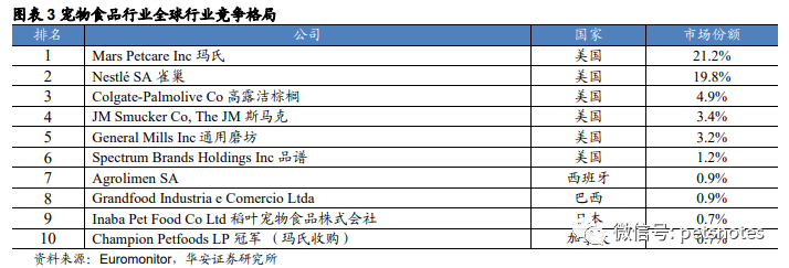 全球宠物食品竞争格局较为稳定,市场份额以美国公司为主导,呈两超多强格局。玛氏和雀巢公司旗下产品线品牌矩阵完整,价格带全方位覆盖,凭借其综合实 力在全球宠物食品市场中占据绝对优势,市占率分别为21.2%和19.8%。