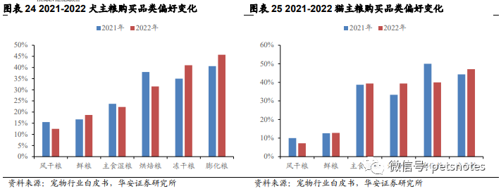精细化、科学化饲养逐渐成为养宠趋势,布局趋势性的升级品类以及差异化产品有望获取更为确定性的增长。犬主粮方面,膨化粮和冻干粮是宠物主主要选择的主粮产品,偏好渗透率分别同比提5.1和6.0个百分点;猫主粮方面,工艺升级的烘干粮和冻干粮渗透率增长较快,冻干猫粮成为最受宠物主偏好的主粮品类。