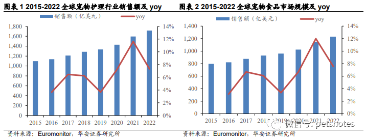 Euromonitor数据显示,2015-2022年全球宠物护理行业销售额从1096.9亿美元增长至1712.6亿美元,年复合增长率6.6%;其中2022年全球宠物食品市场销售额达1234.9亿元,同比增长7.6%。