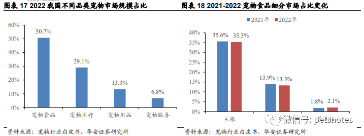 据宠物行业白皮书数据,2022年我国城镇犬猫宠物消费市场2706亿元,同比增长8.7%,其中,2022年宠物食品市场份额50.7%,同比下降0.8个百分点,仍为宠物行业最大的细分市场。