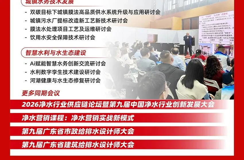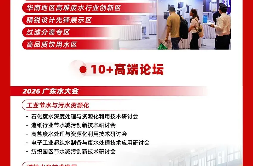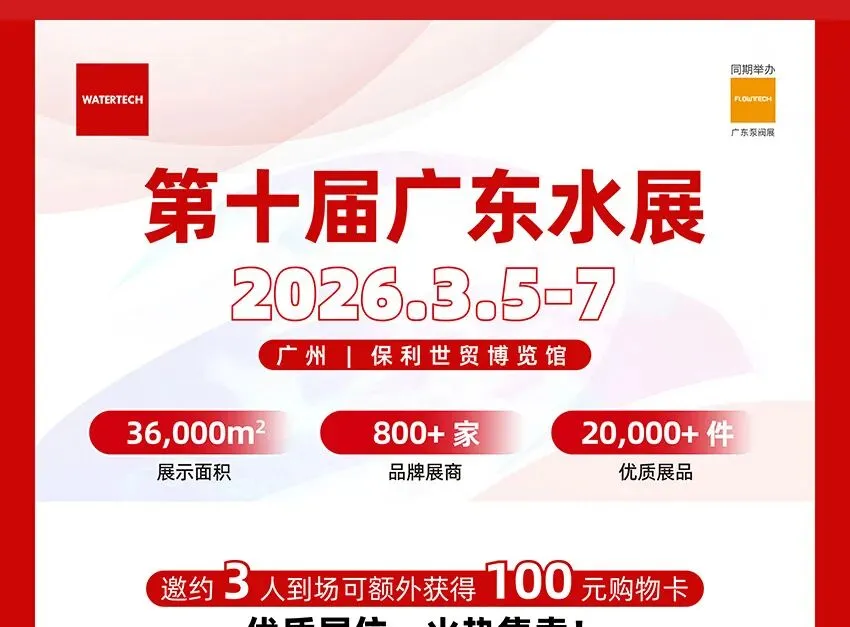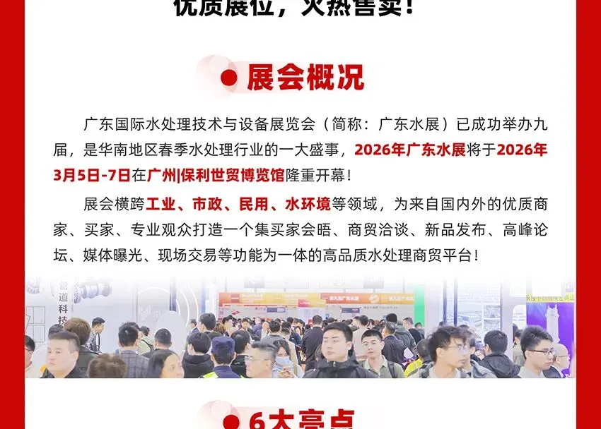 作为华南地区春季水处理行业开年首场盛会,2026广东水展将于3月5-7日在广州·保利世贸博览馆盛大开幕。展会将集结环保水处理、膜与水处理、净水领域的品牌企业,场景应用横跨市政、民用、工业、水环境,涵盖污水/废水处理设备及配套、市政工程及水生态治理、膜及膜配件、工业净水、仪器仪表、净水系统、饮水设备、耗材配件、舒适系统等系列产品,为到场专业观众一站式呈现全产业链水处理技术与方案,为水处理产业的纵深发掘以及难点痛点的突破带来新机遇。