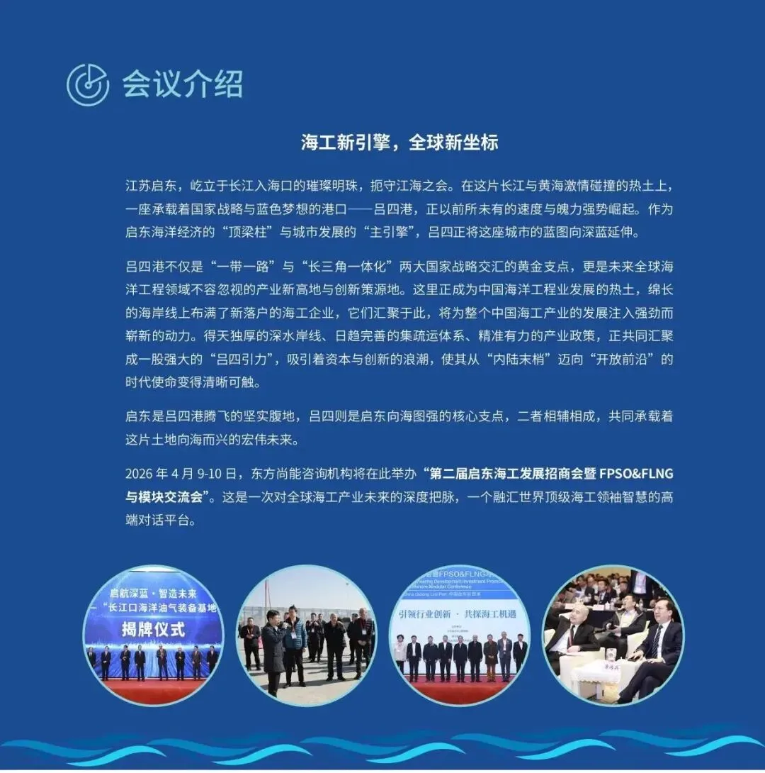 2026年4月9-10日,由东方尚能咨询机构主办的第二届启东海工发展招商会暨FPSO&FLNG与海工模块交流会,将在江苏启东吕四港豪生大酒店重磅启幕。本次活动以“海工智引擎 全球新坐标”为主题,汇聚全球海工产业链领袖、技术专家与投资机构,聚焦吕四港作为“一带一路”与“长三角一体化”战略交汇点的产业势能,打造海工装备领域的高端对话与务实合作平台。