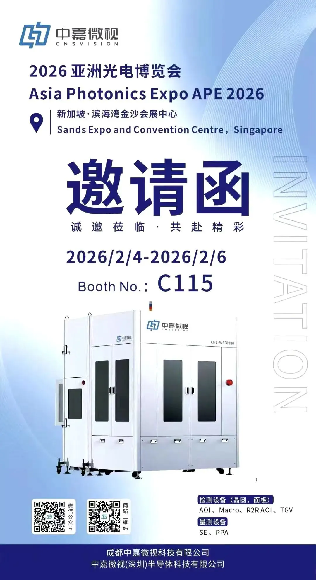 中嘉集团荣幸获邀参加2026年亚洲光电博览会(APE 2026)。本届大会以“聚焦光电与半导体融合,赋能创新生态”为主题,致力于呈现两大领域交汇所催生的颠覆性科技与未来方向。作为亚太地区权威盛会,APE 2026将全面展示信息通信、光学、半导体、激光、红外、传感及量子等全产业链前沿技术与产品。