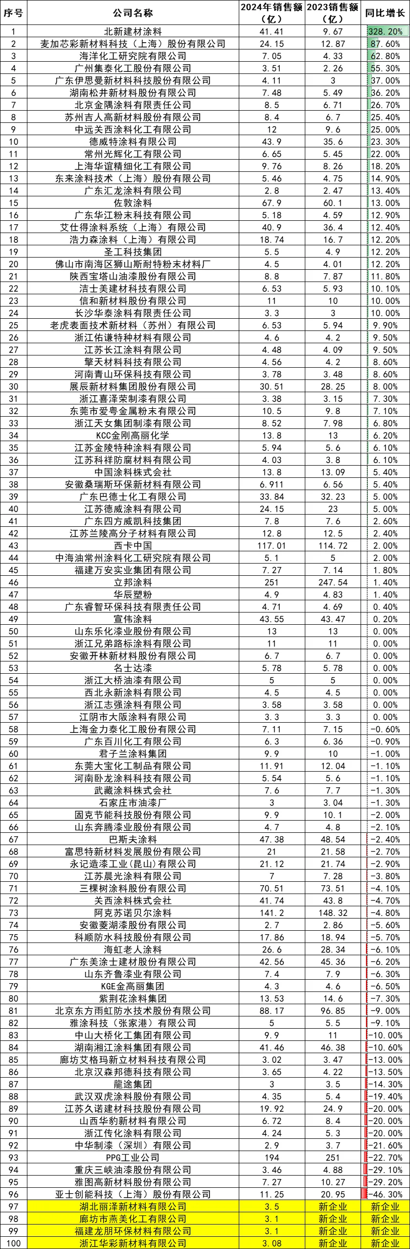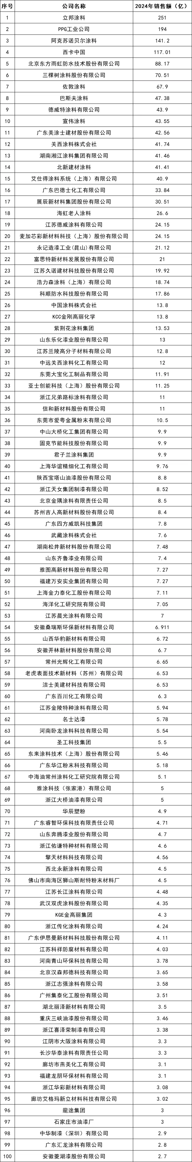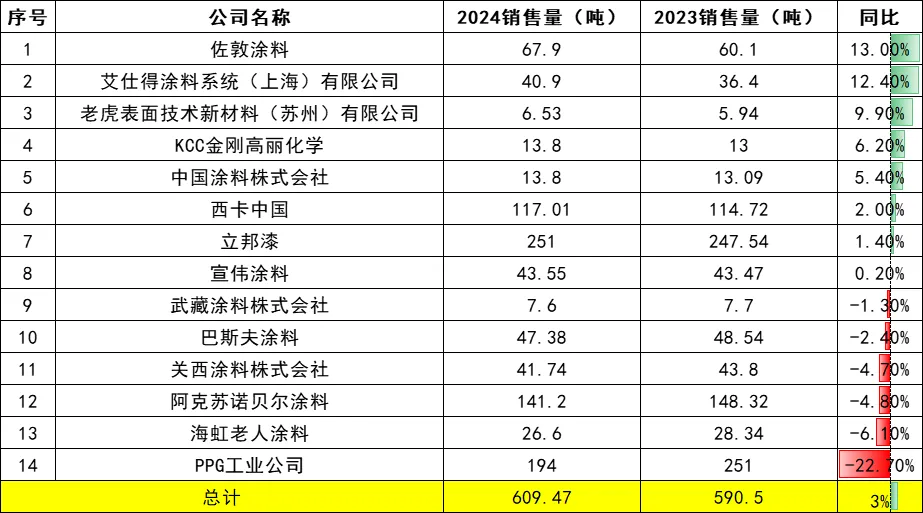 近年来,市场竞争压力如汹涌浪潮般持续攀升,涂料企业间的内卷式竞争态势愈发激烈,众多中小型企业深陷其中,苦不堪言。在这场近乎“自杀式”的内卷漩涡里,整个涂料行业的市场格局正经历着深刻而剧烈的变革,市场空间正悄然且坚定地向头部企业聚集。作为涂料领域极具专业性与权威性的新媒体服务平台,涂料采购网始终密切关注行业动态,深度剖析市场走向。日前,涂料采购网重磅推出《2024年涂料行业销量100强企业排行榜》,从销量这一关键维度,对国内涂料行业的市场格局展开了简明扼要的分析与全面盘点,为行业内外人士提供了极具价值的参考。今日,涂料采购网正式对外发布《2024年中国涂料企业销售额100强榜单》。此次榜单聚焦销售额指标,进一步深入挖掘涂料100强企业的营收变化情况,旨在为行业参与者更精准地把握市场趋势、洞察企业实力提供有力依据。根据《2024年中国涂料企业销售额100强》榜单来看,100家企业2024年涂料总销售额为1995.81亿元,同比2023年的1997.66亿下滑0.09%。备注:数据来源于涂料采购网信息中心,仅供参考,如有差池,请以实际数据为准。从2024年涂料销售额百强企业的增长数据来看,市场格局的分化态势令人瞩目。北新建材以328.2%的惊人增速一骑绝尘,麦加芯彩紧随其后,以87.6%的增速位列次席。在当下涂料市场内卷加剧、企业哀鸿遍野的大环境下,这两家企业却能逆势飞扬,实现销售额翻倍增长,其卓越实力与战略眼光可见一斑,宛如行业寒冬中傲然绽放的寒梅,尽显强者风范。备注:数据来源于涂料采购网信息中心,仅供参考,如有差池,请以实际数据为准。北新建材涂料作为中国央企——中国建材集团旗下的全资子公司,始终秉持着创新进取的发展理念,持续深化“两翼齐飞”战略以拓展业务增量,通过“内生增长”与“外延并购”双轮驱动,锚定目标,力争在两年内实现涂料业务规模迈上百亿体量的新台阶。同时,公司积极推进“全球布局”战略,分阶段推动全业务“走出去”,实现整体协同发展,在国际舞台上绽放光彩。2024年初,北新建材涂料成功完成对嘉宝莉78.34%股权的收购,这一战略举措成效显著。嘉宝莉全年为北新建材贡献营收高达32.2亿元,直接助力北新建材涂料业务规模实现跨越式增长,从原本的9.67亿元大幅跃升至41.41亿元。不仅如此,北新建材涂料还通过收购灯塔涂料(聚焦工业涂料领域)、浙江大桥油漆(强化华东市场布局),成功构建起“建筑+工业”涂料的全体系覆盖格局,产能布局也从华北地区迅速扩展至全国范围,市场份额呈现出快速增长的良好态势。在集装箱涂料这片竞争激烈的商业蓝海中,麦加芯彩凭借在高端应用领域的非凡表现,稳坐中国集装箱涂料行业的王者宝座,已然成为行业当之无愧的翘楚。其集装箱涂料业务在国内市场表现强劲,占据着高达20%的市场份额,在全球范围内更是跻身四大供应商之列,彰显出强大的品牌实力与市场竞争力。麦加芯彩并未满足于现有的成绩,而是以敏锐的市场洞察力和前瞻性的战略眼光,积极开拓新兴市场,尤其是“一带一路”沿线国家和地区。随着这些地区贸易往来的日益频繁,集装箱的需求如潮水般持续增长。麦加芯彩犹如一位经验丰富的航海家,敏锐地捕捉到了这一历史性的机遇,或将借此东风,进一步扬起市场拓展的风帆,扩大自身的市场版图,提升在全球市场的占有率。为了更好地应对市场需求的增长,麦加芯彩积极布局产能扩充战略。其上海生产基地的涂料总产能实现了从2万吨到5万吨的飞跃式增长,并于2024年中顺利完成投产,为市场供应注入了强劲动力。南通生产基地也不甘落后,涂料总产能将从7万吨提升至11.4万吨,相关建设工作已在2024年第四季度紧锣密鼓地启动。而珠海生产基地,即备受瞩目的募投项目,主体建设已基本完工,设备购置及安装工作正有序推进。待项目全面投产后,公司的总产能将达到14万吨。这些充足的产能储备,犹如坚实的后盾,充分保障了麦加芯彩能够及时响应客户需求,高效完成订单交付,为公司的业务拓展提供了稳固而坚实的基础。近年来,国家积极出台一系列政策举措,大力推动民族涂料企业蓬勃发展,全力促进各行各业实现民族品牌替代,以期提升民族涂料产业的整体竞争力与市场地位。然而,从现实的市场格局来看,在高端涂料市场领域,外资企业依旧占据着主导地位,民族涂料企业虽奋起直追,但在高端市场的份额占比仍较为有限。据涂料采购网数据中心显示,在2024年的涂料市场中,14家外资涂料企业表现亮眼,销售额总计达到609.47亿元,同比增长3%,在销售额百强企业中占比高达30%。尤为值得关注的是,佐敦、艾仕得等外资企业增速迅猛,均超过了10%,进一步巩固了其在高端市场的优势地位。这一现状凸显出民族涂料企业在高端市场突破方面仍面临诸多挑战,亟待在技术创新、品牌建设等方面持续发力。在国内涂料行业陷入激烈内卷、竞争白热化的当下,行业高质量发展的步伐却并未因此停滞。众多外资涂料企业犹如装备精良的舰队,凭借深厚的品牌积淀与领先的技术优势,在国内涂料市场的海洋中持续破浪前行,不断加大市场投入与拓展力度。这股强大的外资力量,给部分民族涂料企业的高质量发展之路带来了沉重的压力,如同乌云般笼罩在民族涂料企业前行的天空。然而,换个视角审视,外资涂料在部分细分领域形成的垄断局面,
