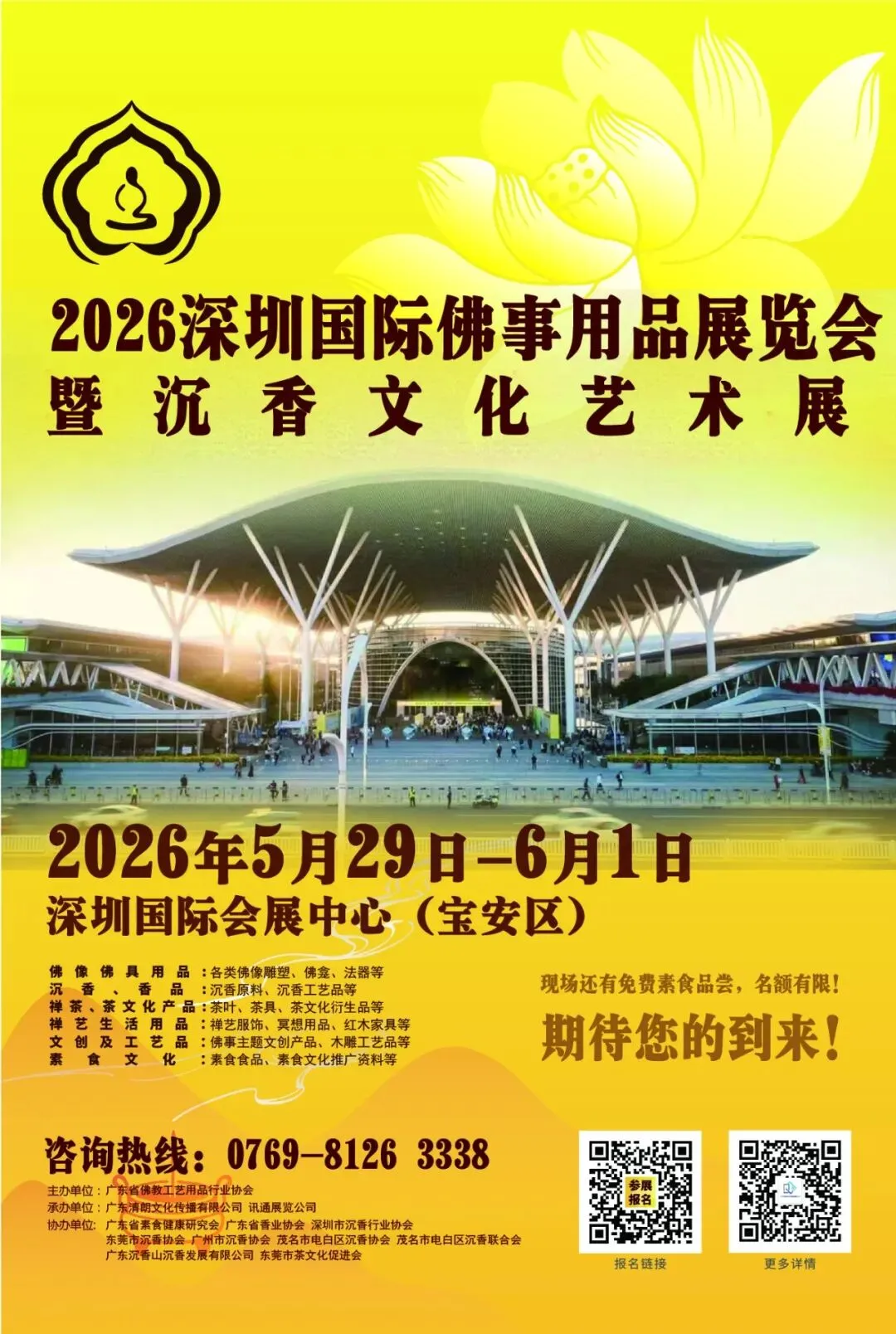 备受期待的2026深圳国际佛事用品展览会暨沉香文化艺术展(下称:深圳佛事展)将于5月29-6月1日在深圳国际会展中心举办。本届展会由广东省佛教工艺用品行业协会主办,广东清朗文化传播有限公司、香港讯通展览有限公司承办,广东省素食健康研究会、广东省香业协会、深圳市沉香行业协会、东莞市沉香协会、广州市沉香协会、茂名市电白区沉香协会、茂市电白区沉香联合会、广东沉香山沉香发展有限公司、东莞市茶文化促进会协办。