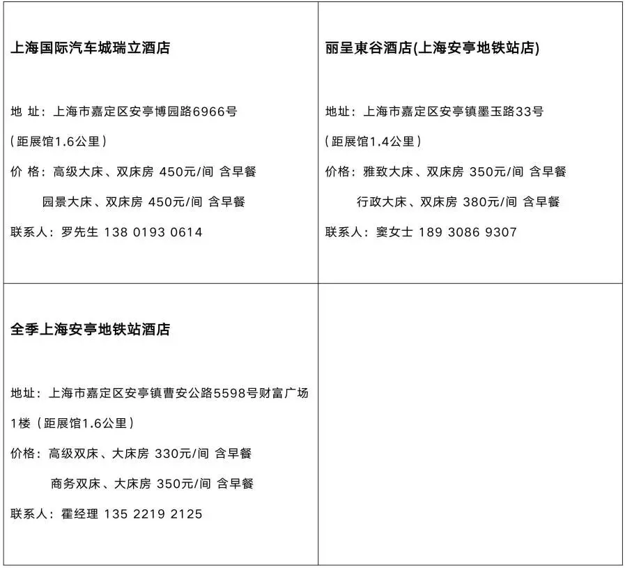 主办方为参会人员推荐以下酒店,并提供展会期间(3月20-21日)的优惠房价与往返会场的定时班车。