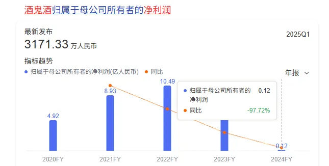 舍得酒2024年的归母净利润暴跌了80%,酒鬼酒更惨,直接暴跌了97%以上。