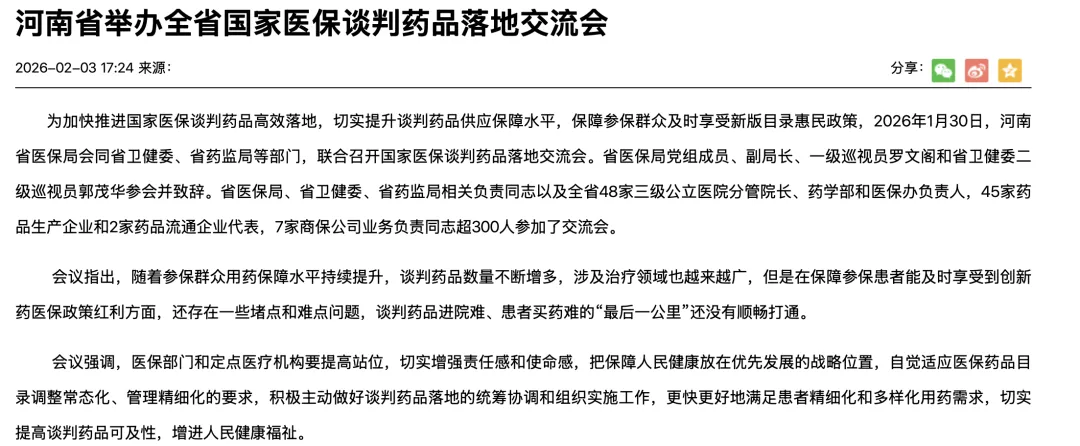 会议要求,定点医疗机构要践行以“患者为中心”理念,通过降低药品运营成本、优化院内药品配置结构等方式“腾笼换鸟”,为谈判药品腾出空间。要建立快速响应机制,在2月底前及时召开药事会,优先配备采购谈判药品。要建立健全处方流转机制,完成与全省统一的医保电子处方流转平台的无缝对接,保障谈判药品在医疗机构和“双通道”药店均能“开得到、用得上、可报销”,进一步提升谈判药品供应保障水平,保障参保群众用药可及性。
