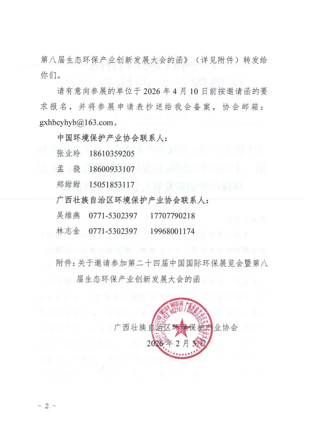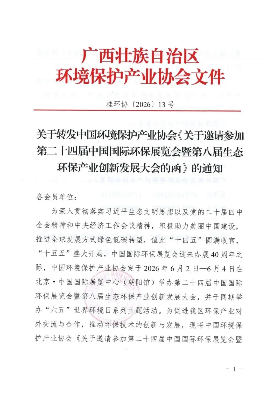 为深入贯彻落实习近平生态文明思想以及党的二十届四中全会精神和中央经济工作会议精神,积极助力美丽中国建设,推进全球发展方式绿色低碳转型,值此“十四五”圆满收官,“十五五”盛大开局,中国国际环保展览会迎来办展40周年之际,中国环境保护产业协会定于2026年6月2日一6月4日在北京·中国国际展览中心(朝阳馆)举办第二十四届中国国际环保展览会暨第八届生态环保产业创新发展大会,并于同期举办“六五”世界环境日系列主题活动。为促进我区环保产业对外交流与合作,推动环保技术的创新与发展,现将中国环境保护产业协会《关于邀请参加第二十四届中国国际环保展览会暨第八届生态环保产业创新发展大会的函》(详见附件)转发给你们。