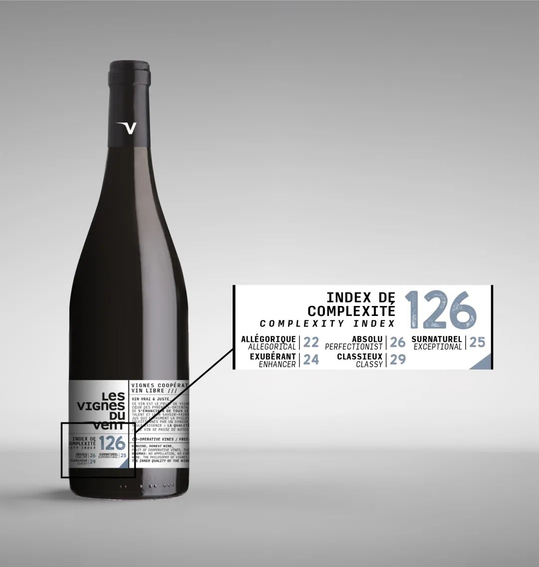 全系列酒款的每个酒标上的拟人化描述词,是LES VIGNES DU VENT的每一款酒进行盲品的时候投票最多的几个词汇(每款酒最高分的几个描述词不一样)。诸如“热情的”“富有魅力的”“时尚的”“令人不安的”等风格描述词,并为每个描述词赋分,词汇旁边的数字就是当时投票给出的单项分数平均分。