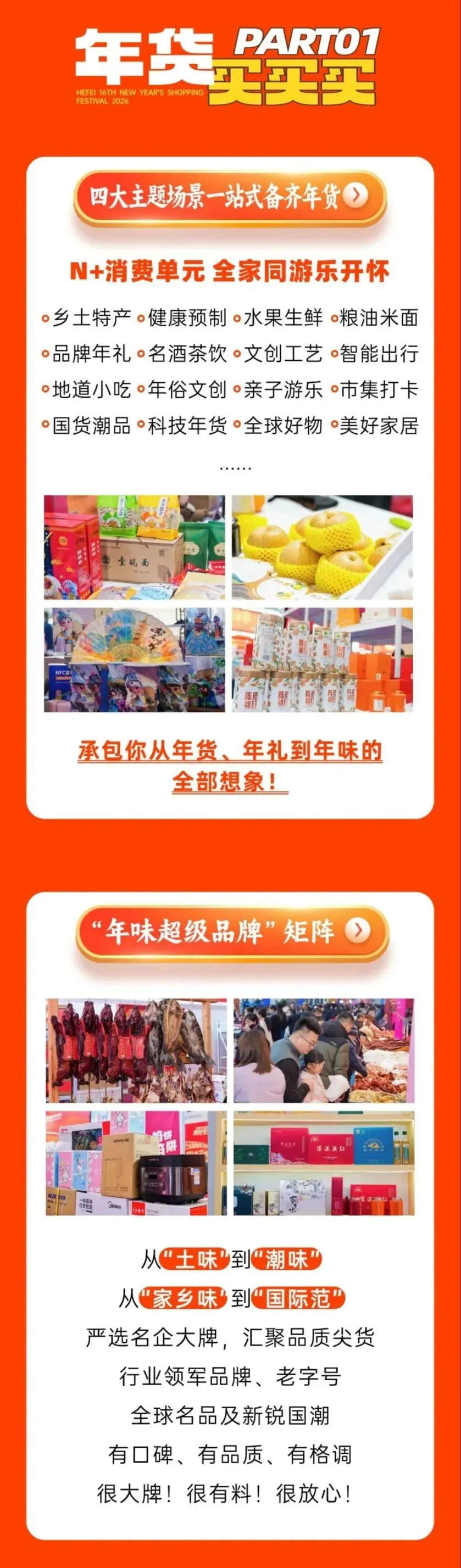 本届年货节展示展销总面积超2万平米,以“归乡、烟火、团圆、新程”为核心,集结了国内外500余家优质企业,涵盖名优农品、休闲食品、家居用品、新春年礼、宠物用品、健康服务等全品类超万款年货,打造一场集展览展销、年味互动、文化传承、品牌共建于一体的现代化年味体验盛会。