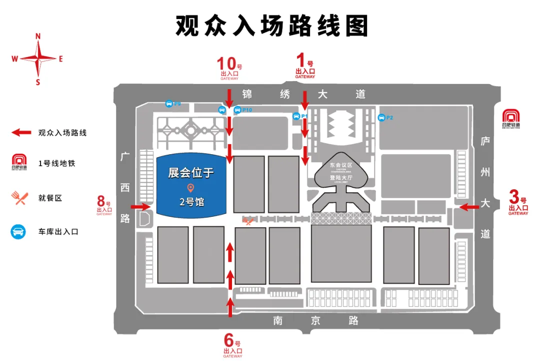 1. 观众请由上图所示锦绣大道1号、10号道口,庐州大道3号道口,南京路6号道口,广西路8号道口进出参观。