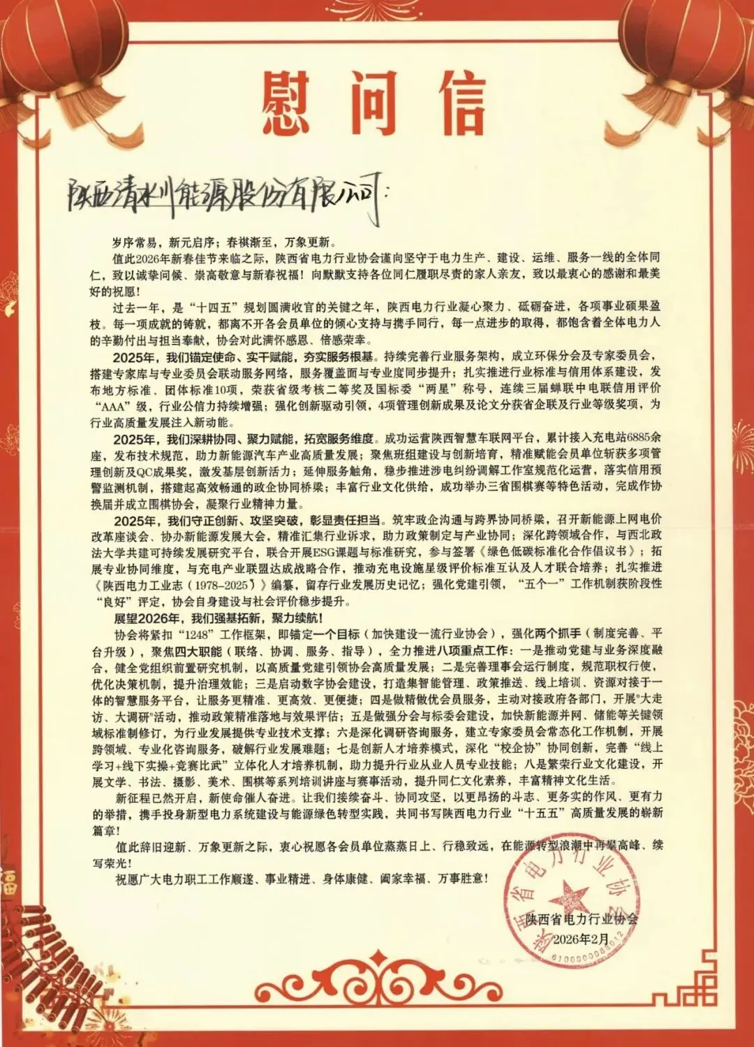 近日,清水川能源收到陕西省电力行业协会发来的新春慰问信。这份满载关怀与肯定的信件,让全体员工倍感温暖与鼓舞。信中向坚守在电力生产、运维一线的同仁及家属致以诚挚祝福,并对公司2025年的工作成果给予高度评价。