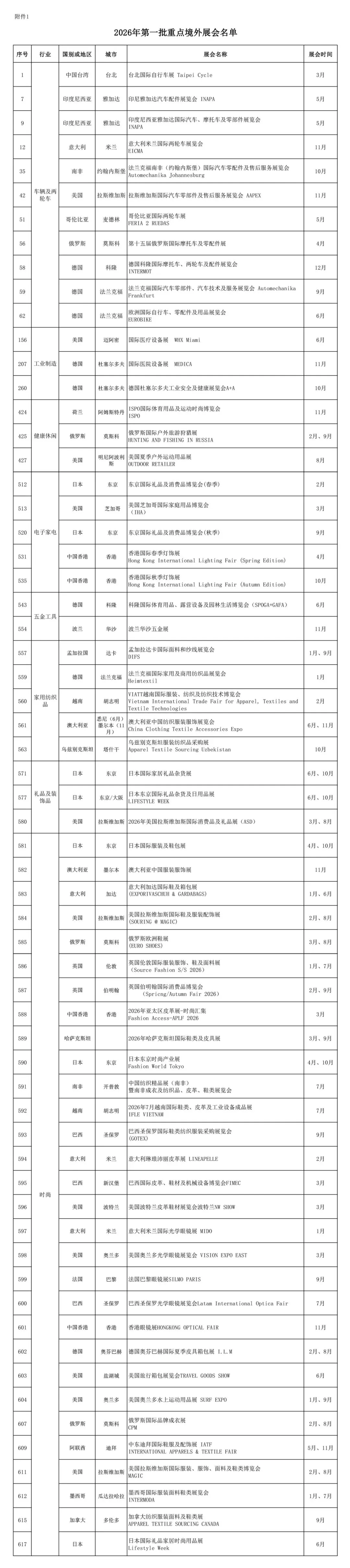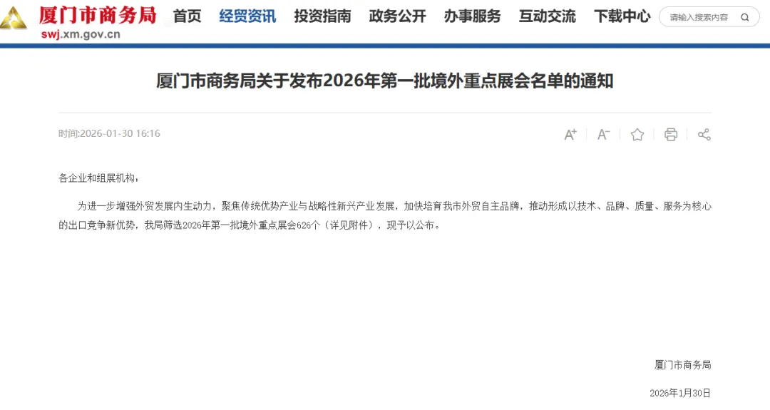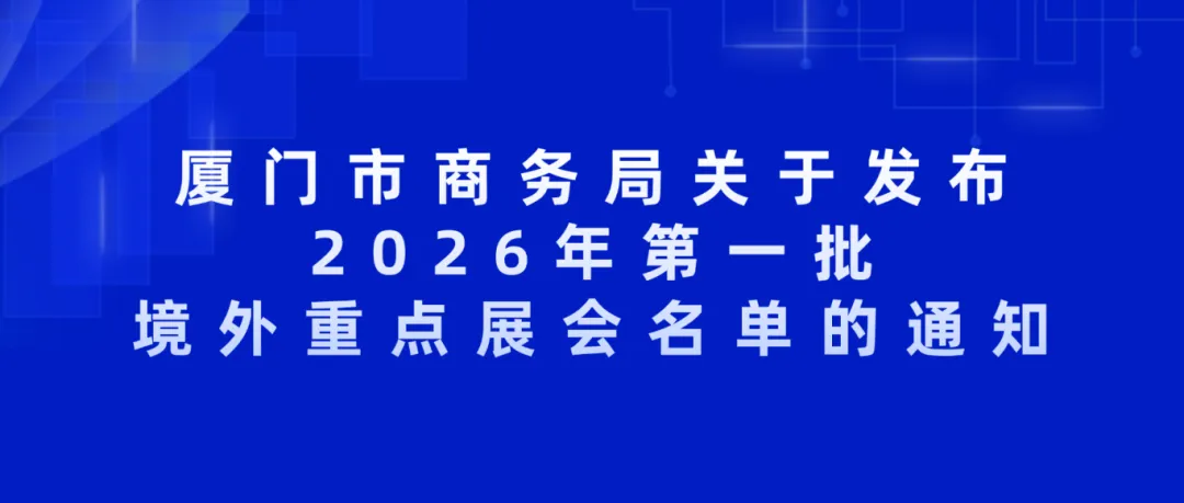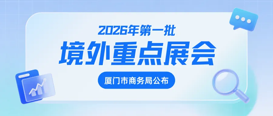 为进一步增强外贸发展内生动力,聚焦传统优势产业与战略性新兴产业发展,加快培育我市外贸自主品牌,推动形成以技术、品牌、质量、服务为核心的出口竞争新优势,厦门市商务局筛选2026年第一批境外重点展会626个(详见附件),现予以公布。
