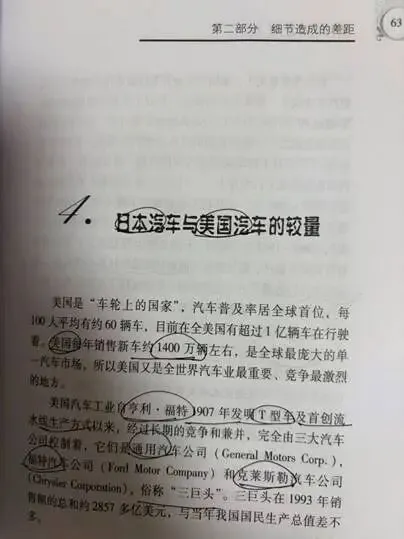4、在汽车的生产中,日本创造出了“精益生产方式”,用精益求精的态度和科学的方法来控制和管理汽车的设计开发。丰田汽车社长认为,其公司最为艰巨的工作不是汽车的研发和技术创新,而是生产流程中一根绳索的摆放,要不高不矮、不偏不歪,而且要确保每位技术工人在操作这根绳索时都没有任何偏差。