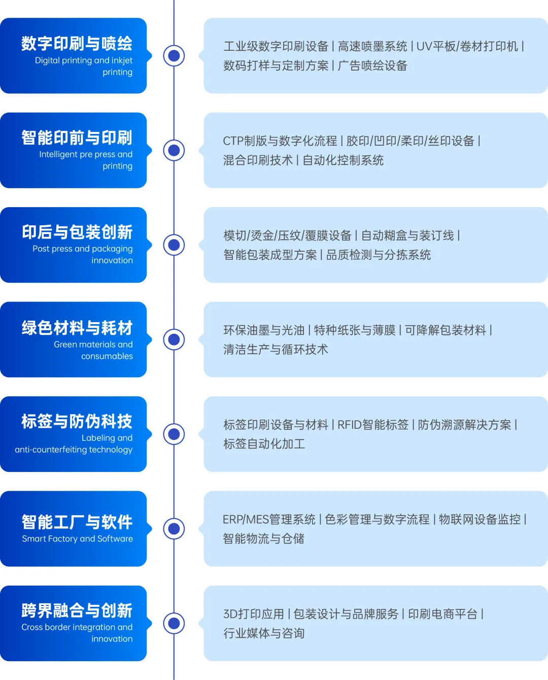 印前设备、印刷设备、印后及包装加工设备、纸张和承印物、油墨、其他耗材、配套和基础设施、服务和软件、创新技术展会亮点: