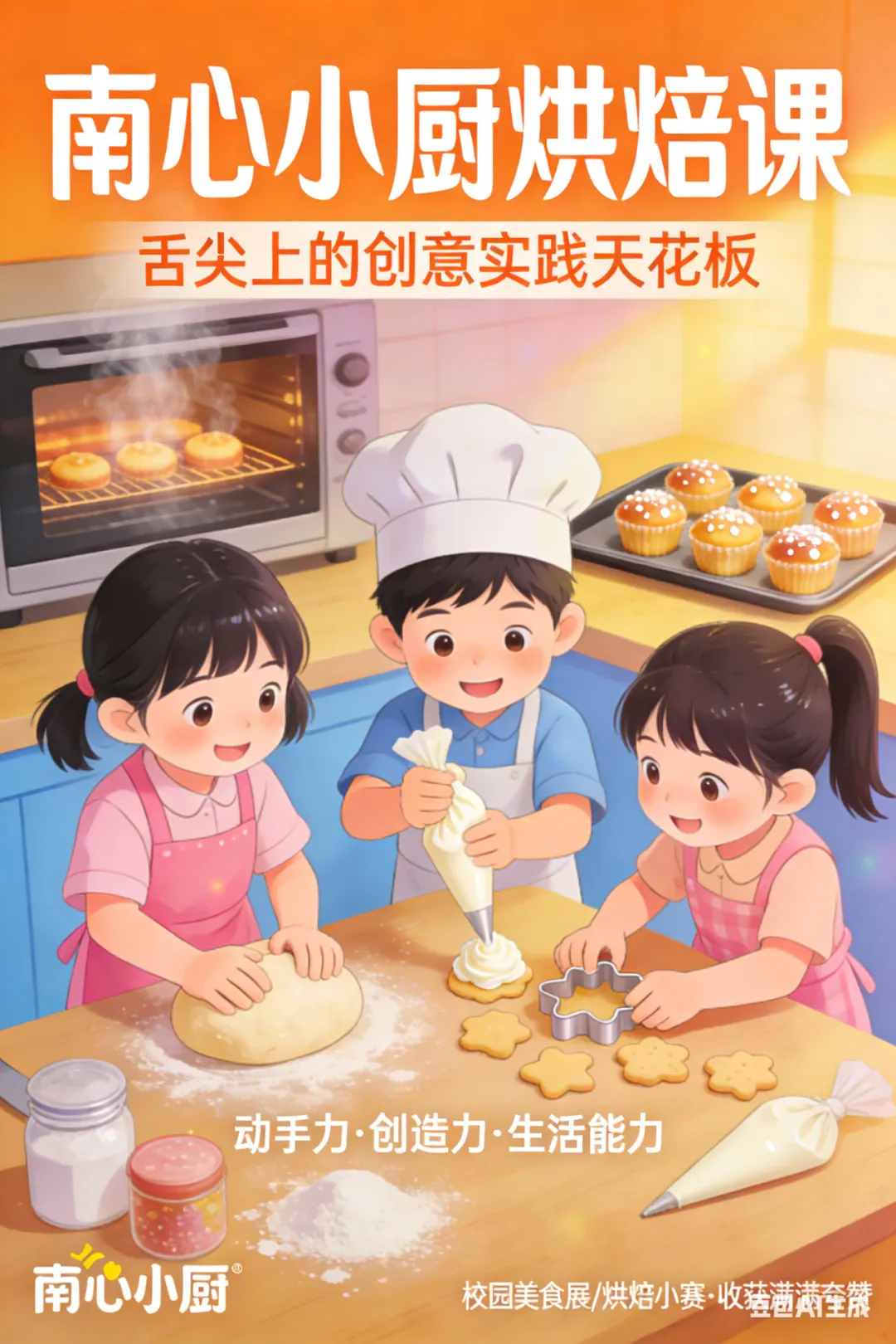 超好玩的南心小厨烘焙课,妥妥是舌尖上的创意实践天花板!孩子们变身玩转面粉糖霜的小小烘焙师,从揉好第一个面团、挤好第一朵奶油开始,让普通食材跟着巧手 “活” 起来。一次次搅拌、烘烤、造型中,把简单原料变成香甜的糕点、可爱的甜品,眼里满是成就感。当这份练出来的动手力、创造力在校园美食展、烘焙小赛中收获满满夸赞时,我们更珍惜的,是孩子心里那颗热爱生活、乐于创造的种子,正慢慢长成温暖一生的生活能力!