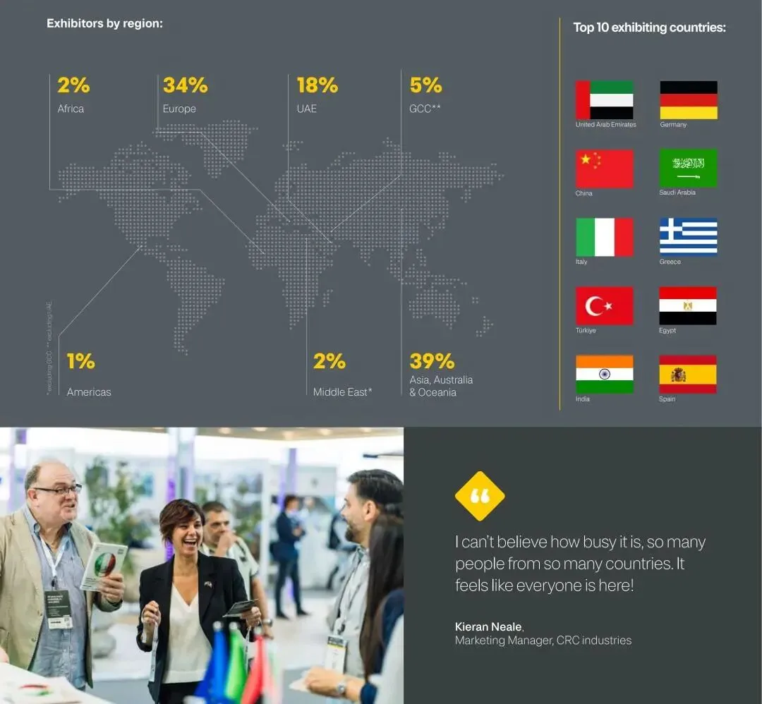 展会期间促成多项谅解备忘录(MoU)签署,包括 Deewan Equipment 与 Alliance Silica 等企业的合作,成为跨境贸易与出口解决方案的核心枢纽。会前举办 “贸易连接器早餐会”,为经销商与供应商提供精准配对服务,提前搭建合作桥梁,助力参会者高效获取高价值商业线索。此外,展会吸引 EMAAR、AECOM、LARSEN & TOUBRO、迪拜水电局等全球知名企业及机构的决策层参与,覆盖项目全生命周期的采购与合作需求。