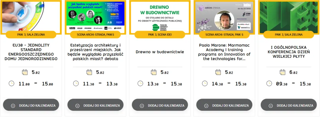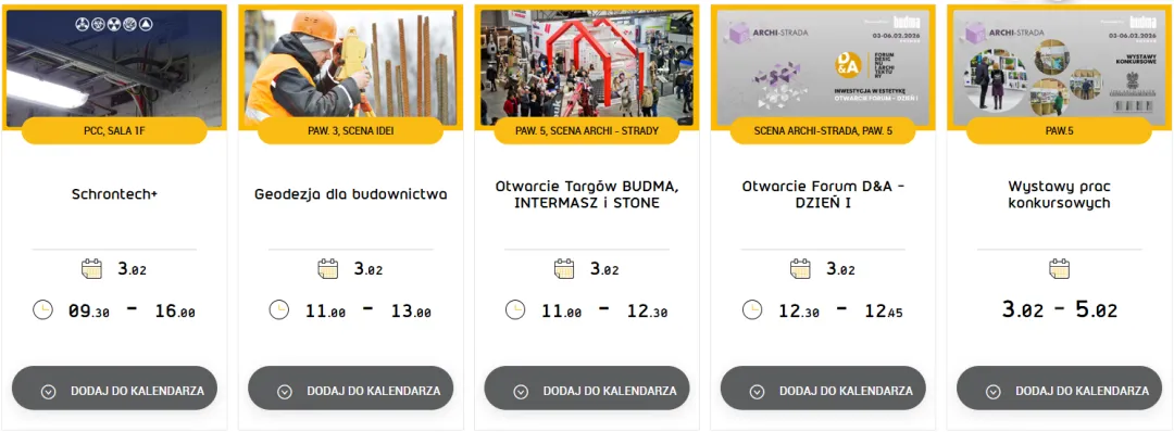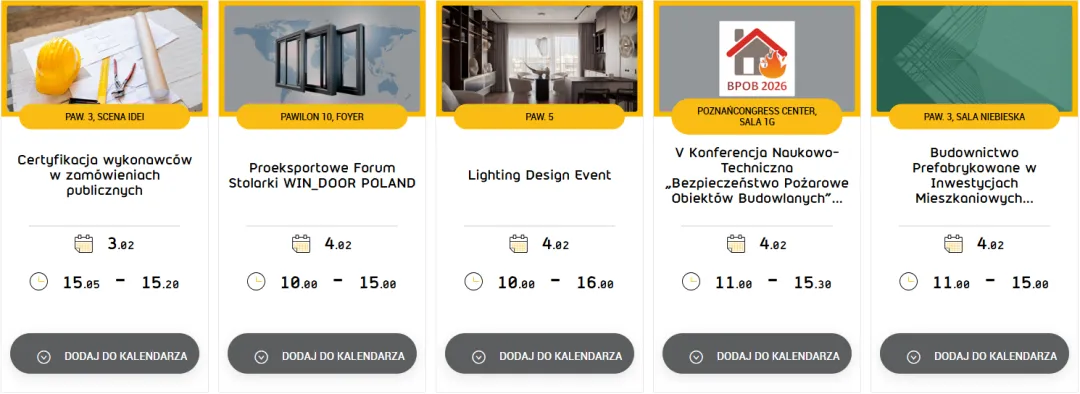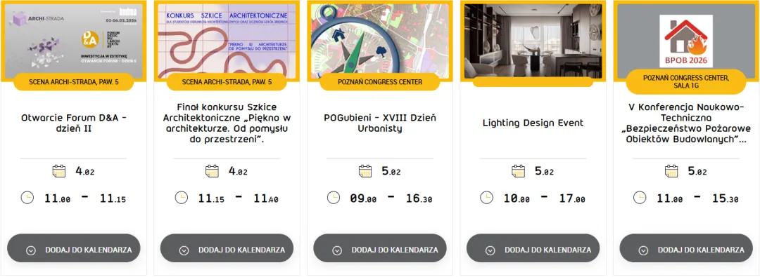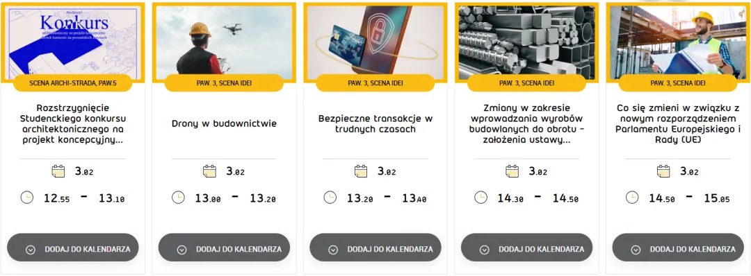 展会日程包含众多回应建筑与设计领域热点议题的专题会议与论坛,例如:设计与建筑论坛、建筑测绘 (Geodezja dla设计与建筑论坛budownictwa)、第五届建筑消防安全科技会议等。