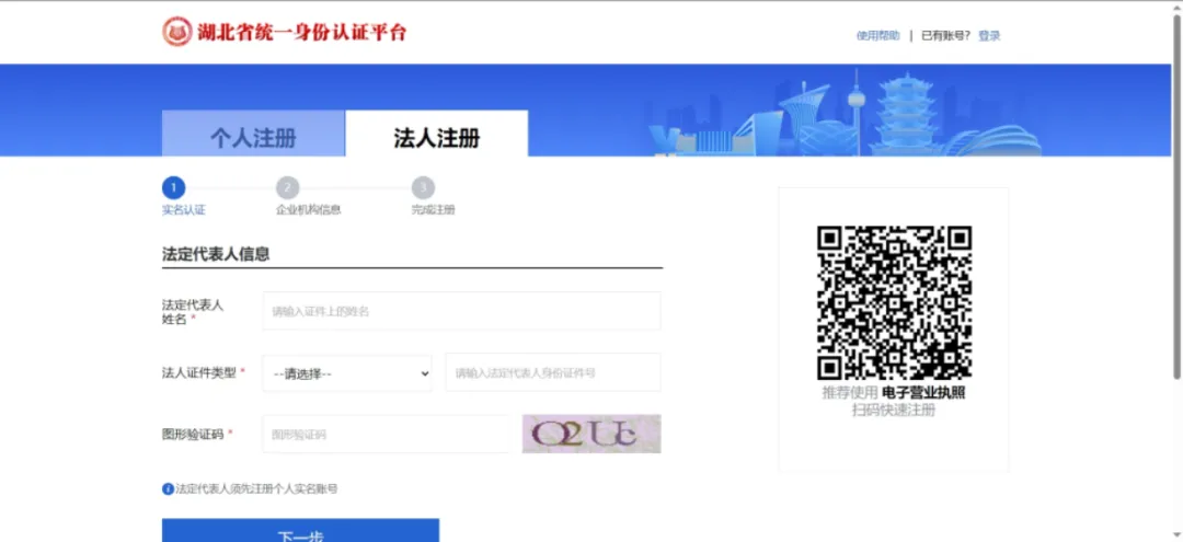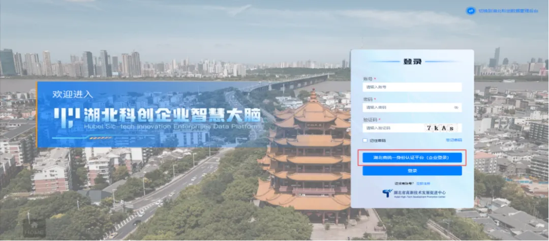 进入湖北科创企业“智慧大脑”,点击湖北省统一身份认证平台,进入湖北省统一身份认证平台页面,支持个人登录及企业登录;有企业账号,使用统一社会信用代码和密码进行登录,登录成功直接进入智慧大脑大屏端。