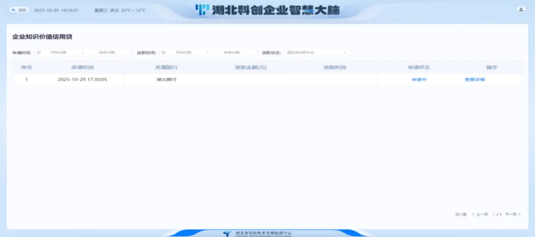在企业中心-特色服务栏目,点击知识价值信用贷图标,选择贷款记录,会打开贷款记录列表页面,可查看贷款记录信息,包括申请时间、所属银行、放款金额(元)、放款时间、申请状态,可查看详情。
