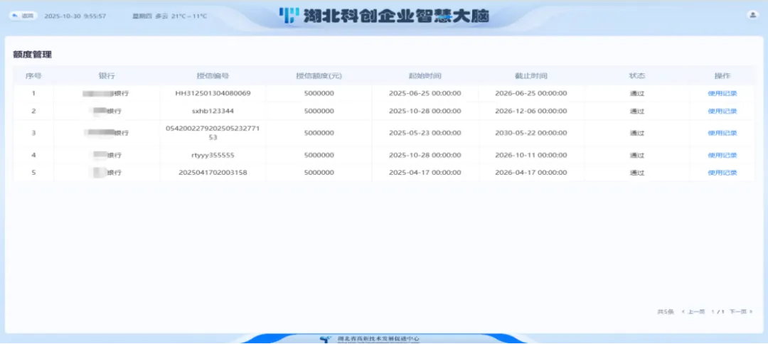 在企业中心-特色服务栏目,点击知识价值信用贷图标,选择额度管理,会打开额度管理列表页面,可查看额度管理信息,包括贷款银行、授信编号、授信额度、授信起始时间、授信截止时间、授信状态等,还可查看额度使用明细。