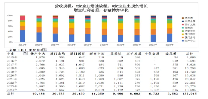 继2024年我们对比8家头部代表企业以2023年数据为基础,从经营指标、筹资及核心竞争力布局三个方面所做的对标分析,本文对头部企业样本做了微调,调出地产占比较高的厦门建发和以数据服务为主的上海钢联,调入更具行业代表性的苏美达和瑞茂通,重点从财务指标分析视角作对比,揭示行业发展现状和趋势,公司的优势和不足,为集团高质量发展谋划提供参考。