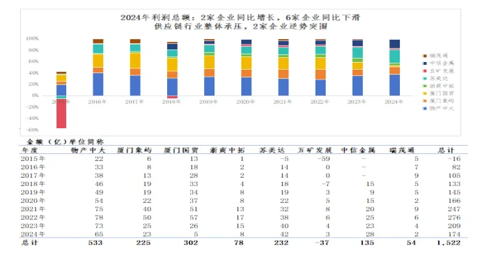 从行业整体来看,2015年至2024年,物产中大、厦门象屿、厦门国贸等头部企业营收规模显著扩大,行业总营收从4000亿增长至18686亿元,显示出供应链行业的快速发展。但从2022年开始总营收下滑,反映出行业内部竞争加剧以及宏观经济环境的变化对行业的影响。盲目追求规模扩张可能陷入“虚假繁荣”(应收账款增加但现金流恶化,部分企业资产减值损失、信用减值损失挤压利润总额40%甚至50%),未来企业还是需要通过优化客户结构、增加供应链服务、深入产业链等职能来增强自身的盈利能力。