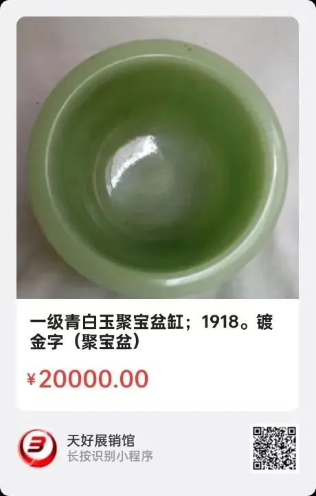 一级青白玉聚宝盆缸;重量1500克,口径14cm,高10.5cm,镀金字(聚宝盆),一级青白玉为白中闪青或闪黄,透闪石含量高,质地细腻,是和田玉中的优质品种。清代宫廷玉器常用此类材料,历史底蕴深厚。真品颜色自然柔和,白中闪青或闪黄,分布均匀;质地细腻坚韧,手感冰凉。纹理独特,线条细腻;呈油脂或蜡状光泽;和田玉硬度较高(6.5-6.9),小钢刀划刻无痕;敲击声清脆悠长;(仿品声音沉闷短促。)清中期聚宝盆象征招财进宝,是传统风水摆件,市场需求稳定。稀缺性:一级青白玉原料稀缺,且镀金字工艺增加独特性。出自杭州名人家藏,保值增值空间大。来源1918.V。