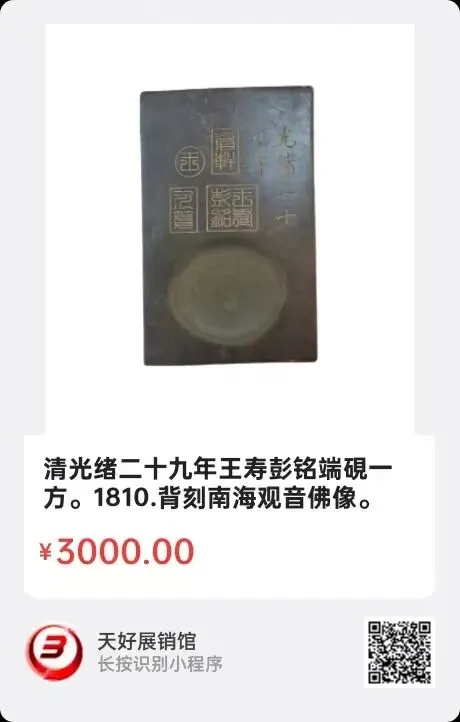 清光绪二十九年王寿彭铭端硯一方。背刻南海观音佛像。長23Cm,宽15Cm,厚1.5Cm,重1525克。来源1810.V。