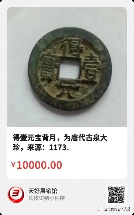得壹元宝背月,为唐代古泉大珍,直径:33cm,重量:18.7。来源:1173.V。