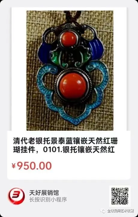 清代老银托景泰蓝镶嵌天然红珊瑚挂件,银托镶嵌天然红珊瑚一大一小,两面相同图案镶嵌,上部老银镂空錾刻一蝴蝶形,中间镶嵌天然小珊瑚珠,下部为镂空如意形,当中镶嵌天然大珊瑚珠,如意形内框中似有外文字母,框架结构为老银,中间填景泰蓝色,当中突出天然红珊瑚珠,珊瑚纹理清晰,无色差且纹理各不相同,清代工艺,做工考究,回流物品,佩戴大方,是自带和送礼的佳品。尺寸:长53毫米,宽37毫米,厚17毫米,重38.88克。来源0101.V.