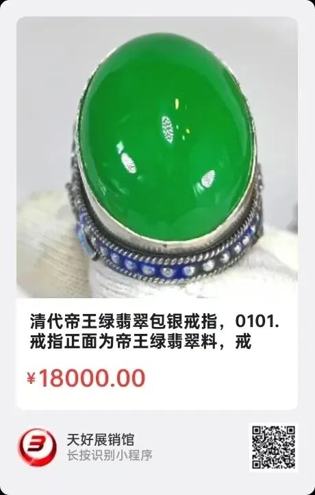 清代帝王绿翡翠包银戒指,戒指正面为帝王绿翡翠料,戒面呈蛋面形,迎光能看到戒面翠料中有丝丝絮状和少许杂质,包银戒架两侧各有一蝴蝶,并涂有法郎彩,老银戒扣可以调节,戒架内部有“乾隆御赐”,是否真乾隆御赐无从考究,但戒面应为清代帝王绿翡翠、戒架为老银无疑,工艺也是清代工。如只认证书,不认清代帝王绿翡翠料的朋友,建议到专门鉴定清代翡翠的北京古抑斋公司鉴定,如不符合清代翡翠料,不出证书不收费,如是真品,每件收1200元,出具证书,永久承认证书的有效性并承担法律责任。尺寸:长31毫米,戒面20Ⅹ26毫米,重25.56克。来源:0101.V.