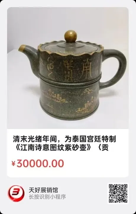 清末光绪年间,为泰国宫廷特制《江南诗意图纹紫砂壶》〈贡局造〉,高10.2㎝,口径6.5㎝,底圏足8.3㎝,总长15.5㎝。简介:此壶系清光绪年间宜兴为泰国宫廷订制的一批紫砂壶中的一只,壶底浮刻楷书“贡局”,边围二龙戏珠纹,此壶墨绿泥,圆筒型,壶身描金绘江南山水,篆字“江南春色”,“吉祥如意”,壶钮,嘴及肩沿花口描金,盖沿饰金色花边。该紫砂壶抛光,唯美,造型简洁素雅,做工精巧,倍受藏家追捧。据传,这批壶当年都出自阳羡制壶大家之手,具很高的艺术价值。来源1510.V。
