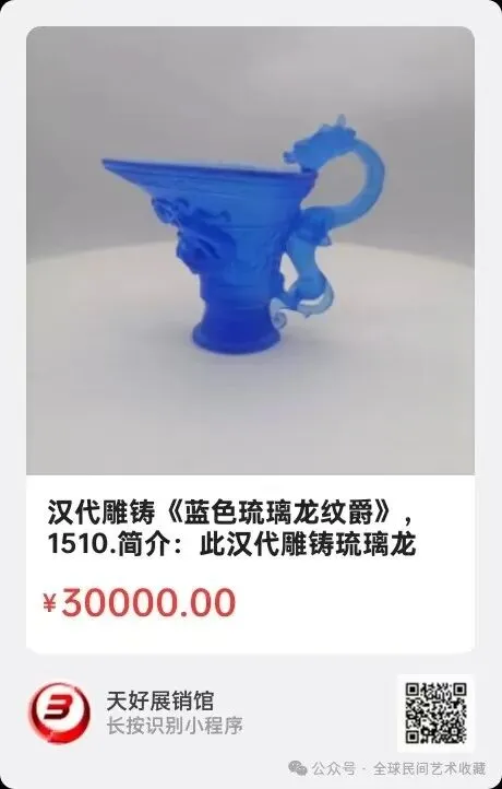 汉代雕铸《蓝色琉璃龙纹爵》,高9.2㎝,椭圆口径6x8.3㎝,横长11㎝,底径3.6㎝,重196克。简介:此汉代雕铸琉璃龙纹爵,通体海蓝色,爵(杯)口前尖,后圆,椭圆型,是仿青铜器加工浇铸。爵把由一条栩栩如生的龙首龙体构成,爵两侧有匍匐螭龙附壁,爵口沿阔由回字纹勾勒,整体设计严谨、端庄秀丽。工艺精湛,是我国琉璃制造工艺巅峰时期的产物。古代称琉璃是一种天然宝石,似水晶、碧玺。古人认为人们摆放或佩戴琉璃制品,可得祛病、坚韧、灵感三种福缘。此琉璃爵实为饮酒器,材质与海蓝色彩,以及工艺给人以艺术享受,明澈的琉璃对人向征着人格,精神与境界,可做财神信物,祐护拥有者聚富及实现美好心愿!来源1510.V.
