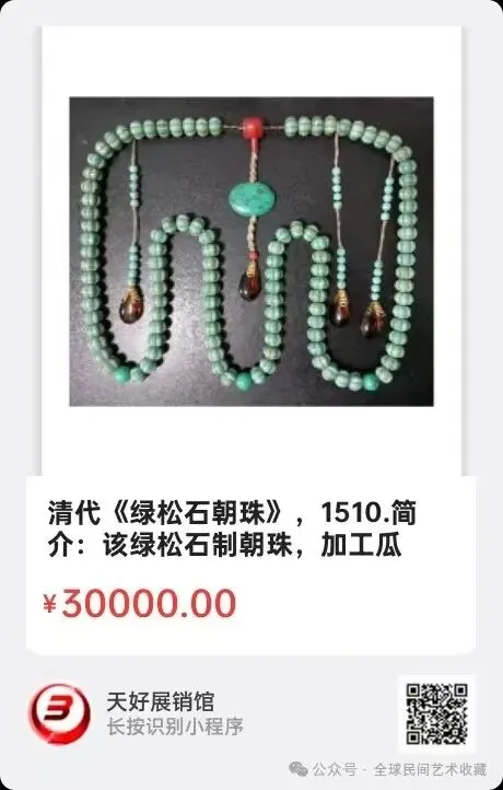 清代《绿松石朝珠》,直径17.5㎝/颗,朝珠总重558.5克。简介:该绿松石制朝珠,加工瓜瓣型珠,背云用绿松石,坠角用紫红色碧玺制,整体端庄优雅,彰显了宫廷贵气,向征着官运亨通,国泰民安。来源1510.V.