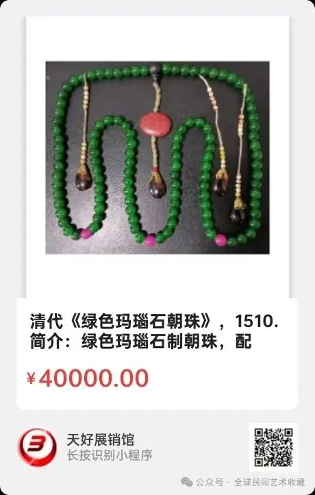 清代《绿色玛瑙石朝珠》,直径14㎝/颗,朝珠总重437克,108颗珠。简介:绿色玛瑙石制朝珠,配沉香木佛头,红松石背云,三颗红玛瑙石珠。青翠色彰显大国风范,贵人贵气。给人以稳重高雅的气质感受!来源1510.V.