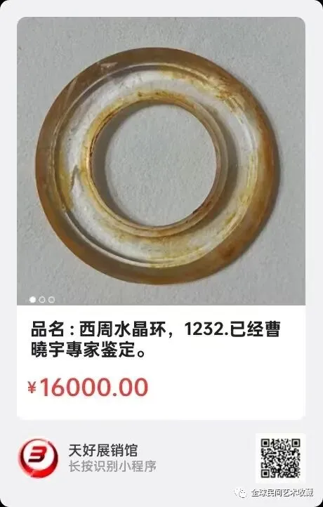 品名 : 西周水晶环,尺寸 : 外径約 5.5 cm,內径約 2.2 cm,厚度 :約 0.8 cm,已经曹曉宇專家鉴定。来源:1232.V。